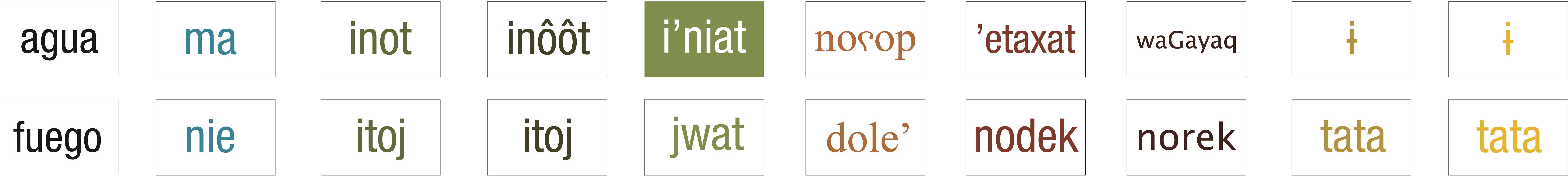 Hay en el verbo partes que son portadoras de sentidos que en las lenguas europeas se expresarían por medio de preposiciones o adverbios de lugar. Más aún, es posible variar la palabra con una misma base o raíz, sólo cambiando la información sobre dónde se realiza o la dirección hacia donde se dirige: selot’ot ‘dirijo la mirada hacia arriba’ y selotapege ‘dirijo la mirada hacia adelante’, o senotarasom ‘salto hacia el agua’ o senotarasegem ‘salto hacia arriba’ (como cuando se sube a un árbol). Se advierte, de paso, cómo la geografía y el medio se incorporan a la gramática de la lengua.